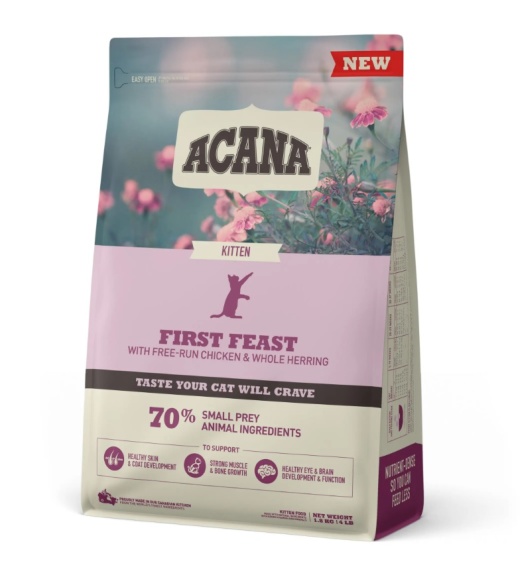 Acana First Feast iclui, na sua formulação, frango e arenque inteiro em rácios WholePreyTM. Concebida para fornecer tudo o que o seu gatinho precisa para um crescimento e desenvolvimento saudável.