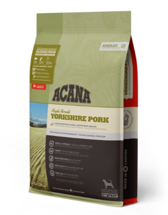 Acana Yorkshire Pork é um alimento monoproteico que inclui, na sua formulação, porco fresco em rácios WholePrey™.